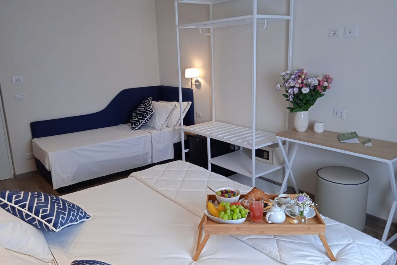 Un ambiente spazioso ed elegante, pensato per ospitare fino a 3 adulti, con un letto matrimoniale e un letto alla francese, dove ogni dettaglio è studiato per regalare un soggiorno in pieno relax. Tutte le camere sono insonorizzate e sono dotate di: Wi-Fi, telefono, smart Tv, cassaforte, minibar, aria condizionata, riscaldamento, armadio, scrivania, bagno moderno, con doccia, lavabo, bidet, asciugacapelli, linea cortesia e set da bagno composto da telo corpo, telo viso, telo bidet.